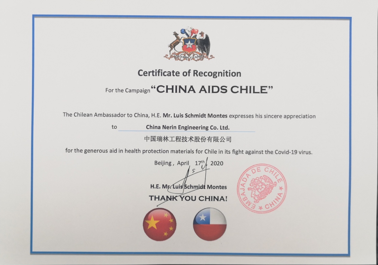 “中國馳援智利”活動捐贈證書